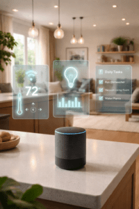 1. خانه هوشمند: ترموستات دمای خانه را تنظیم می‌کند. لامپ‌ها هم خودکار خاموش می‌شوند.