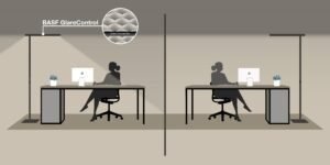 در میز کار، شدت روشنایی باید حداقل 500 لوکس باشد. شاخص خیرگی (UGR) نیز باید در محدوده قابل قبول باقی بماند. در فضاهای اداری، مقدار UGR باید کمتر از 19 باشد تا تمرکز کاربران حفظ شود.